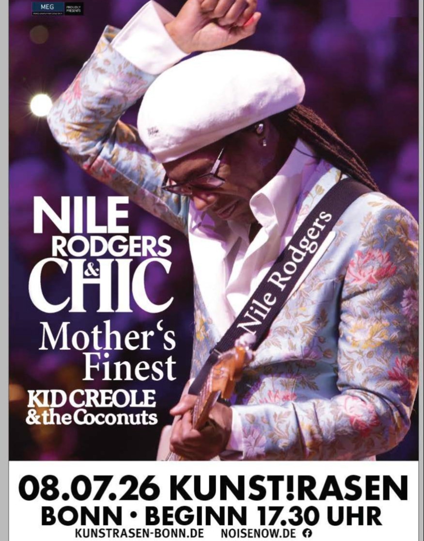 Nile Rodgers & CHIC treten am 8. Juli 2026 auf dem Kunstrasen in Bonn auf. Mit dabei sind Mother’s Finest und Kid Creole & The Coconuts als Support. Ein Abend voller Funk- und Disco-Hits erwartet euch.